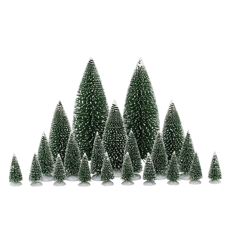 Your village landscaping needs will be solved all at once with this set of thickly needled pine trees in many different sizes. Group them together in clusters to create small grove in a village park, or line them up along the roadway to mimic an old fashioned windbreak. Choose several different sizes to surround a lighted house, keeping the smaller trees close to the building to show off details. Approx. size (H x W x D): 9.02" (22.9 cm) tallest treeYear released: 2020Made of: PlasticProduct type: Trees