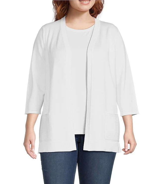 Leo & Nicole Plus Size Pointelle Trim 3/4 Sleeve Open-Front Cardigan