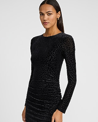 Leopard Burnout Crew Neck Long Sleeve Ruched Midi Dress