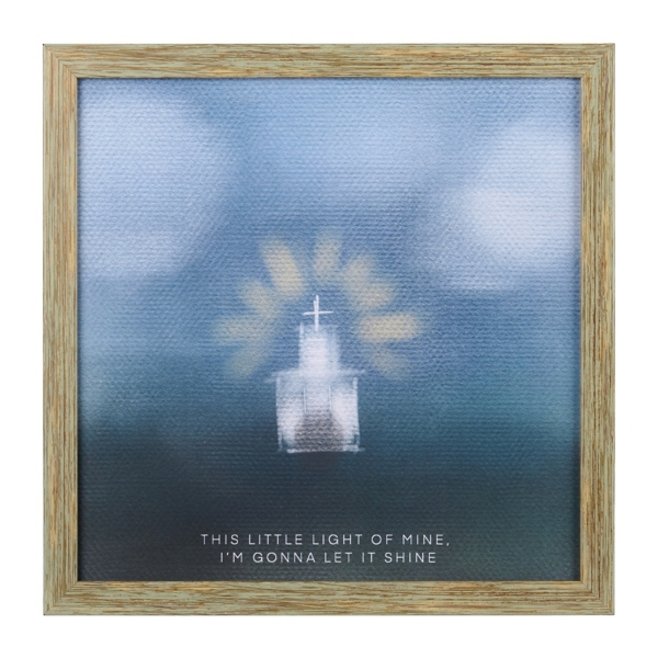 Embrace a touch of faith in your wall decor with this Let It Shine Church Framed Wall Plaque. Its inspiring phrase will bring a sense of bliss to your home! Overall dimensions Width: 13.18 in. Depth: 1.03 in. Height: 13.18 in. Frame crafted of wood Gray frame finish Features the phrase "This little light of mine, I'm gonna let it shine" Church subject Hues of blue, white, and yellow Weight: 2 lbs. Hangs from back-mounted hardware Care: Dust with a soft, dry cloth. Contact your local Kirkland's store for availability. Quantities and selection may vary by location.