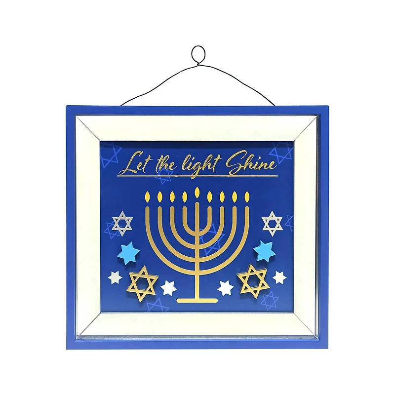 Wish your guests a happy Hanukkah with this wall sign from Ashland. This decorative sign features a lit menorah design with "Let the Light Shine". Display this accent on any wall in your living room or entryway wall.Details:Blue11.8" x 10.43" (30cm x 26.5cm)MDF, acrylic, plywood, and ironFor indoor use
