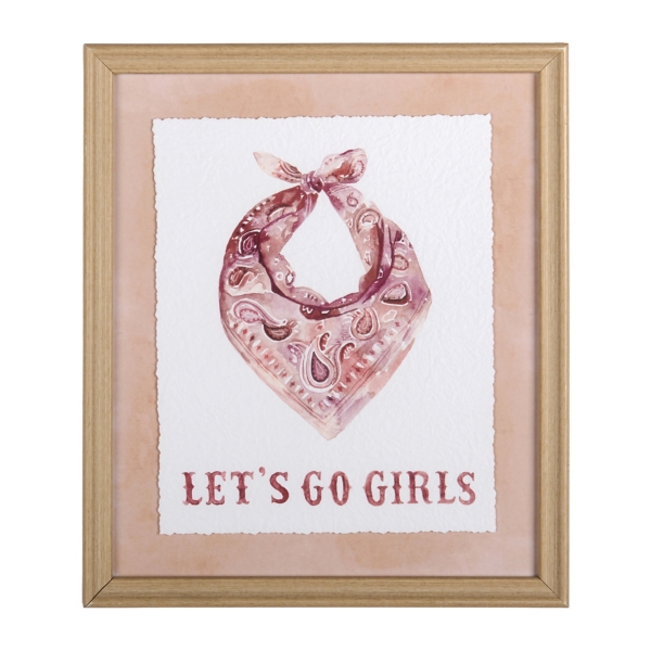 This Lets Go Girls Bandana Wall Plaque puts an adorable twist on western decor. Evoking the fun of the rodeo, it's the perfect finishing touch for any cowgirl's room! Overall dimensions Width: 11.88 in. Depth: 0.75 in. Height: 13.88 in. Crafted of plastic and glass Tan finish Bandana subject Features the phrase "Let's go girls" Hues of pink and white Weight: 1 lbs. Hangs from back-mounted hardware Care: Dust with a soft, dry cloth. Contact your local Kirkland's store for availability. Quantities and selection may vary by location.