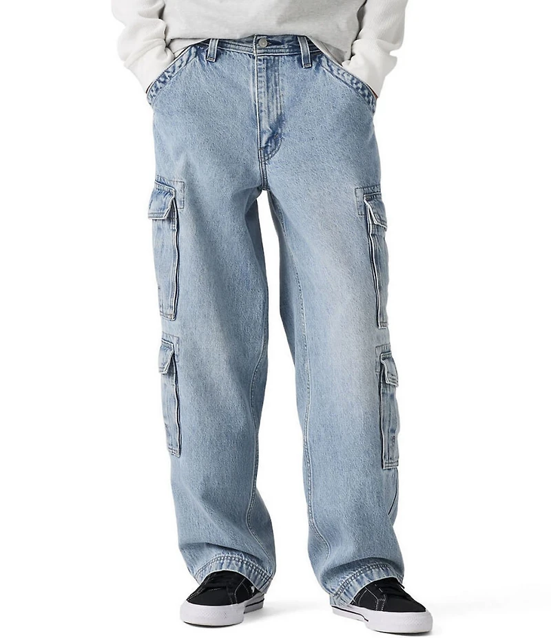 From Levi's®, these jeans feature: Baggy fit through the seat and thighs Zip/button front closure Belt loops 5-pocket jeans 2 slanted front pockets 2 back pockets Full length Straight legs Side cargo pockets Cotton/elastane denim Machine wash/tumble dry Imported.