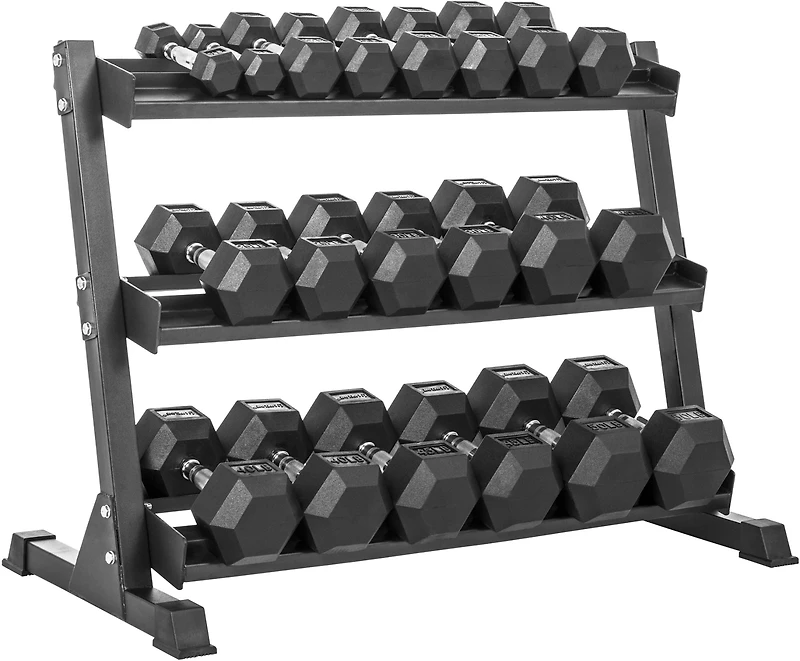 Use the Lifeline 5 to 50 pound Hex Rubber Dumbbell Set with 3-Tier Storage Rack to help build muscle and tone your body. The dumbbells have a rubber covering to dampen noise and ergonomic triple-knurled chrome handles for a comfortable grip. The hex design stops the dumbbells from rolling for safe use, and the 3-tier storage rack makes it easy to organize the weights after you're done with your workout.