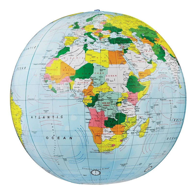 Introduce children to geography with this inflatable world globe. This playful and brilliantly colored inflatable world globe allows children to play and learn at the same time. Details:16" DiameterPlasticExtremely durableLight blue oceanSmooth globe surface