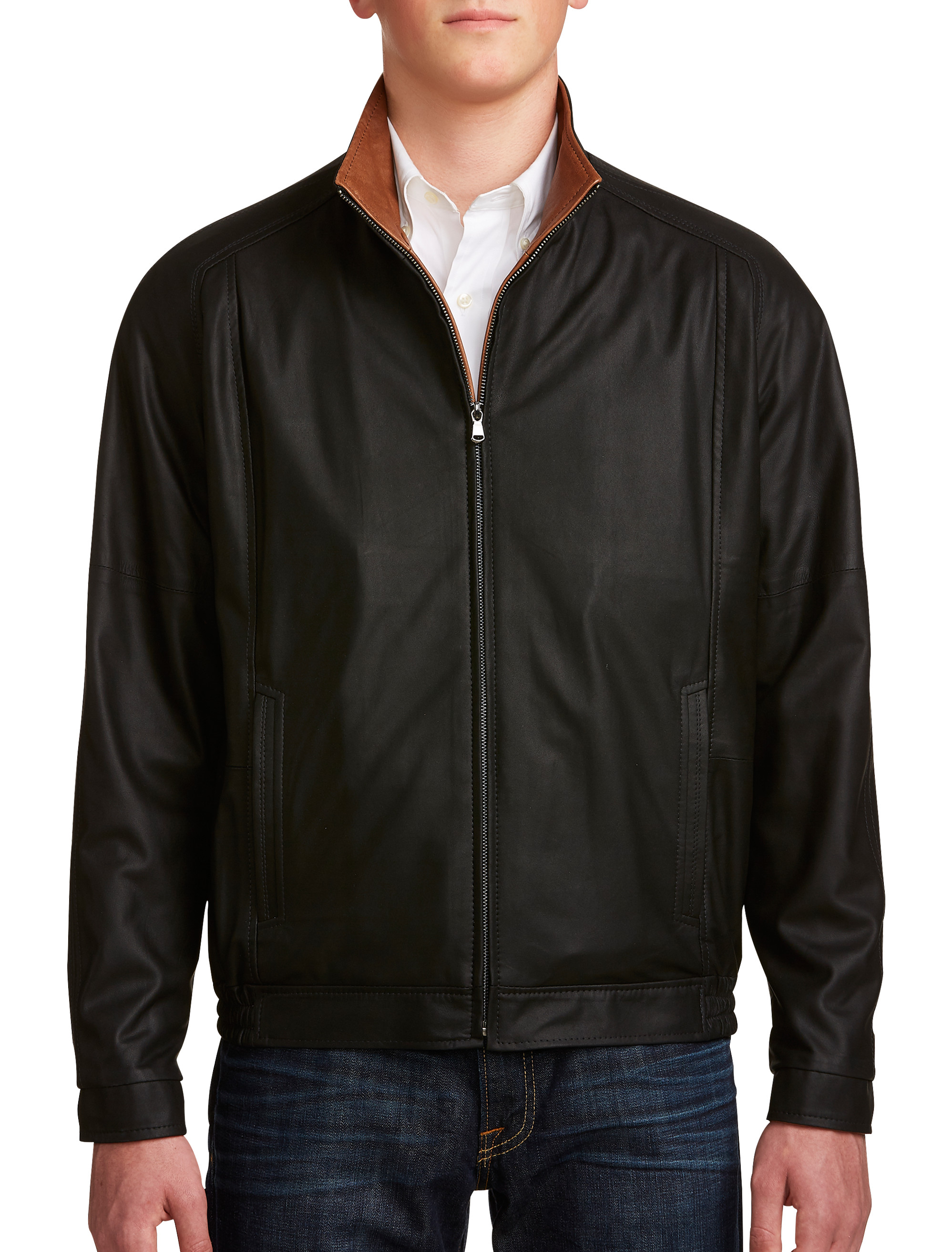 A classic leather jacket is an essential that belongs in every man's wardrobe, and Remy makes some of the best in the world – right here in the USA. This style features finely calibrated, lightweight leather with a fold-over neck band and snapped-cuffs faced in contrast trim. The full-zip style has seamed shaped shoulder details, welted side pockets and elasticized side insets for a comfortable fit.