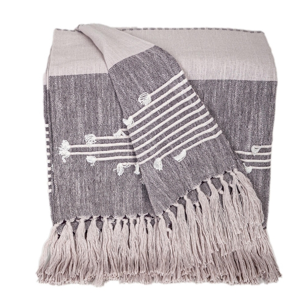 Made with breathable cotton, this Light Gray Slub Striped Tassel Throw is perfect for every season. Its chic design will bring both style and comfort to your home! Throw measures 50L x 60H in. Crafted of cotton Slub fabric design Woven striped accents Hues of gray and white Tassel accents Care: Machine wash cold on gentle cycle. Tumble dry. This item is available at Kirklands.com only, not available in stores. Please note: this item cannot be shipped to APO/FPO addresses.