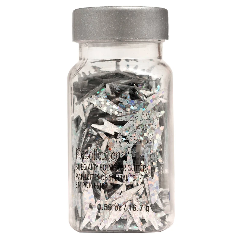 Add some sparkle to your papercrafts with this silver lightning bolt-shaped specialty glitter by Recollections. You can use it to accentuate your mason jars, flower vases, décor accents, and more.Details:Silver0.59 oz. (16.7 g)PlasticDo not ingest and do not use on the body