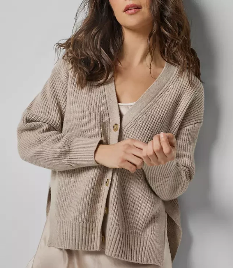 Infused with a luxe touch of cashmere, the Relaxed Side Vent Cardigan is knit in a chunky cardigan stitch, giving this style texture and structure while maintaining a soft handfeel and beautiful shape. Designed with a relaxed fit, this modern take on a classic cardigan features tall side slits, creating an effortless, easy - to layer silhouette. Hitting at the hip, it pairs perfectly with a satin dress or bottoms for an elevated look, or throw it on over a crisp poplin shirt with denim for everyday wear. This item can only be exchanged or returned by mail., Imported:, Length: 23"long, measured from a size S Loft Lilla P Relaxed Side Vent Cardigan Size XS Wheat Women's by Loft Size Regular - XS Wheat Women's Crew, Neck Long Sleeve Cardigan Sweaters Dressy