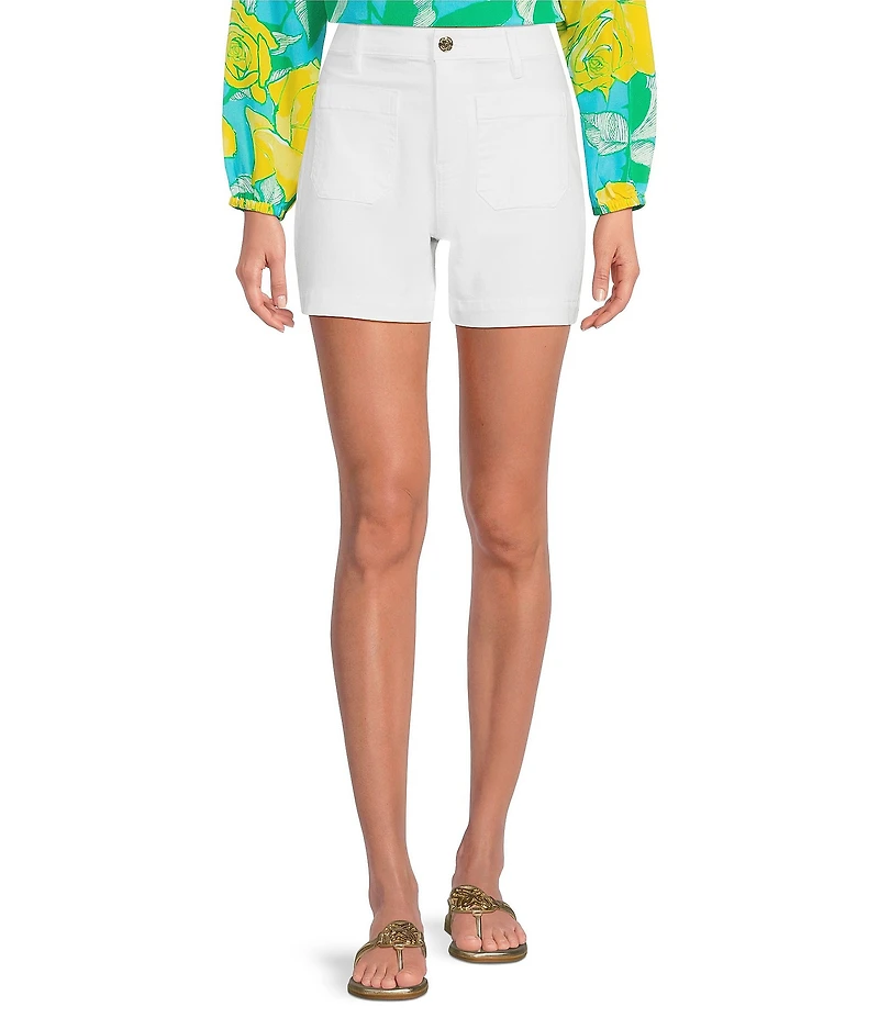 From Lilly Pulitzer, these shorts feature: Denim fabrication High rise Front patch pockets Belt loops Straight fit Front button/zip closure Approx. 5" inseam Cotton/elastane Machine wash Imported.