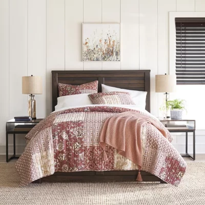 A comfortable blend of farmhouse and cottage style patterning in large patchwork style piecing. Perfect color and pattern for everyday style and comfort. Whether it is for a master bedroom or guest room, this comfortable pre-washed all cotton quilt is cozy and beautiful.