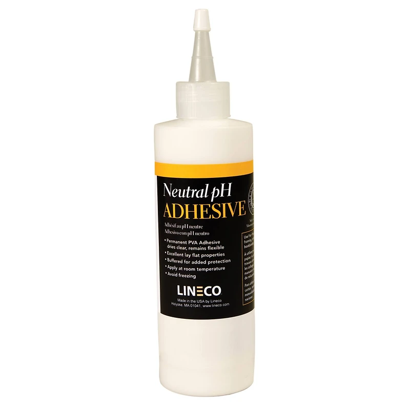 This adhesive has excellent lay-flat properties and dries clear for professional, finished work. White it sets fast is can be remoistened with water for removal or repositioning. Formulated specifically for preservation materials, this adhesive remains durable yet flexible, and will not become brittle with age.Details:White, dries clear8 oz. bottleAcid-freePolyvinyl acetate formulaFormulated specifically for preservation materials
