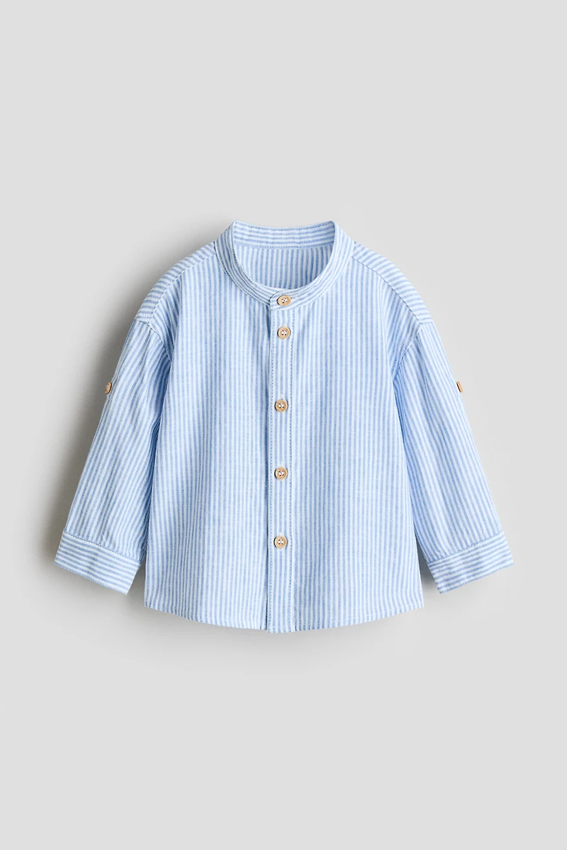 Shirt in a soft, airy woven cotton and linen blend. Band collar, buttons at front, long sleeves with roll-up tab and button, and button at cuffs.