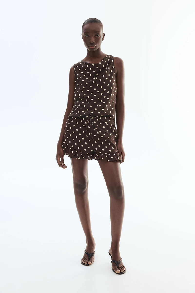 Shorts in an airy woven linen and viscose blend. Ruffle-trimmed waistband with covered elastic, a narrow drawstring at sides with pendant at ends, and discreet side pockets. Ruffle-trimmed hems.