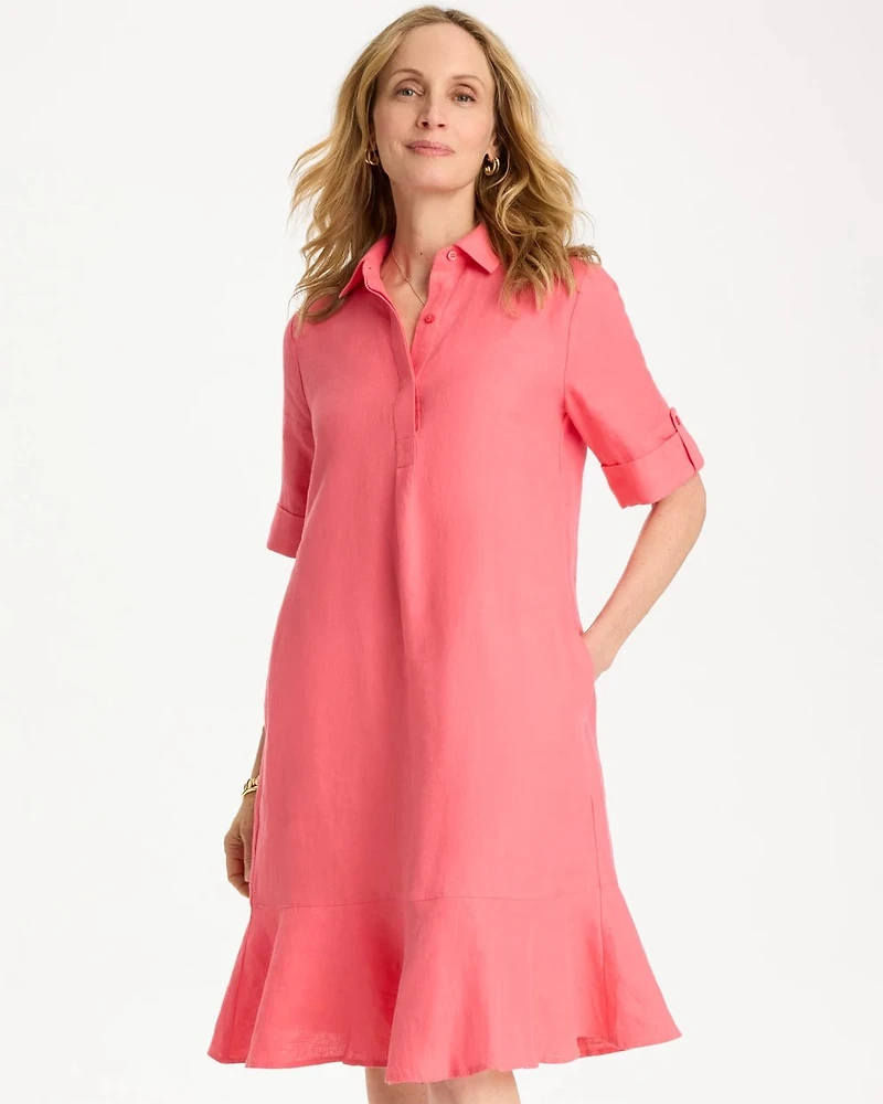 Made with breathable, lightweight linen, elevated by a flounce hem, classic collar, and split neckline. Roll cuff sleeved dress that hits at the knee.