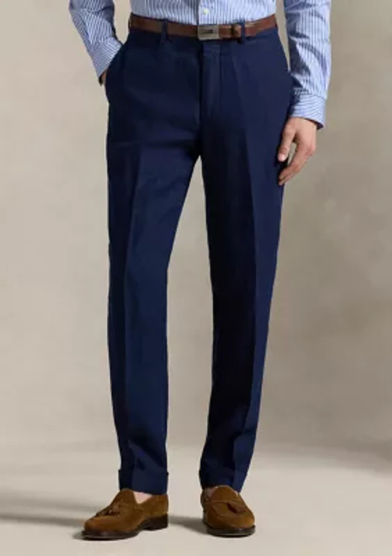 These trousers are tailored from textured slub linen that was custom developed for Polo Ralph Lauren. Size 32W has an 8.75" rise and a 14.75" leg opening. Belt loops. Zip fly with a hook-and-bar closure. Curtain waistband. Two front angled pockets. Right hip coin pocket. Two back buttoned pockets. Lined to the knees. Shell: 100% linen. Lining: 54% polyester, 46% viscose. Machine washable. Imported. Model is 6'1" (185 cm) and wears a size 32W x 32L. Imported