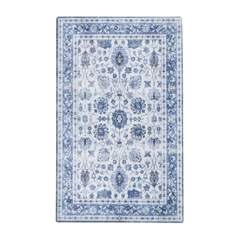 Transform your home's ambiance with a practical and charming machine washable rug, showcasing a vintage floral blue print. this rug complements your decor seamlessly while maintaining the durability needed for the demands of daily life. it's sturdy and perfect for active households with children and pets. the innovative design ensures straightforward cleaning and upkeep, providing a worry-free way to preserve a fresh and inviting atmosphere in your living space.