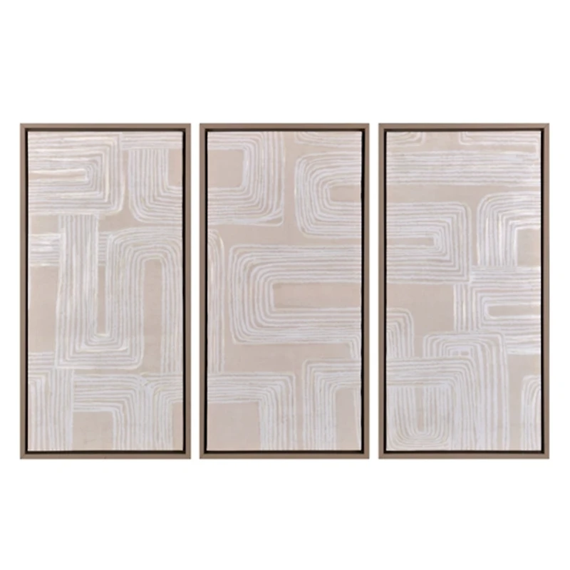 These Lines in the Sand Framed Canvas Prints turn any blank wall into a stunning display. Their abstract, geometric designs are sure to stand out in your space! Set includes three (3) framed canvas prints Each framed print measures Width: 14.5 in. Depth: 1.38 in. Height: 28.5 in. Distinctively printed on stretched canvas Brown frame around wrapped canvas Abstract subject Hues of tan and white Prints with tinted gel accents Hangs from back-mounted hardware Care: Dust with a soft, dry cloth. Contact your local Kirkland's store for availability. Quantities and selection may vary by location.