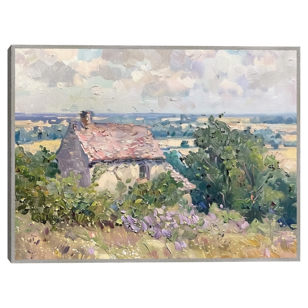 The sunny countryside captured in this Little House Framed Canvas Art Print will bring a cheery touch to your home. Its impressionist style adds a genuine touch to any art collection! Overall dimensions Width: 41 in. Depth: 1.5 in. Height: 31 in. Printed on stretched, polycotton blend canvas Gray frame around wrapped canvas Features a landscape with a house Hues of green, blue, tan, white, red, gray, brown, and purple Artist: Riley B Weight: 9 lbs. Hangs from back-mounted hardware; sawtooth hangers included Care: Dust with a soft, dry cloth. This item is available at Kirklands.com only, not available in stores. Please note: this item cannot be shipped to APO/FPO addresses. WARNING: Cancer and Reproductive Harm - For more information go to www.P65Warnings.ca.gov .