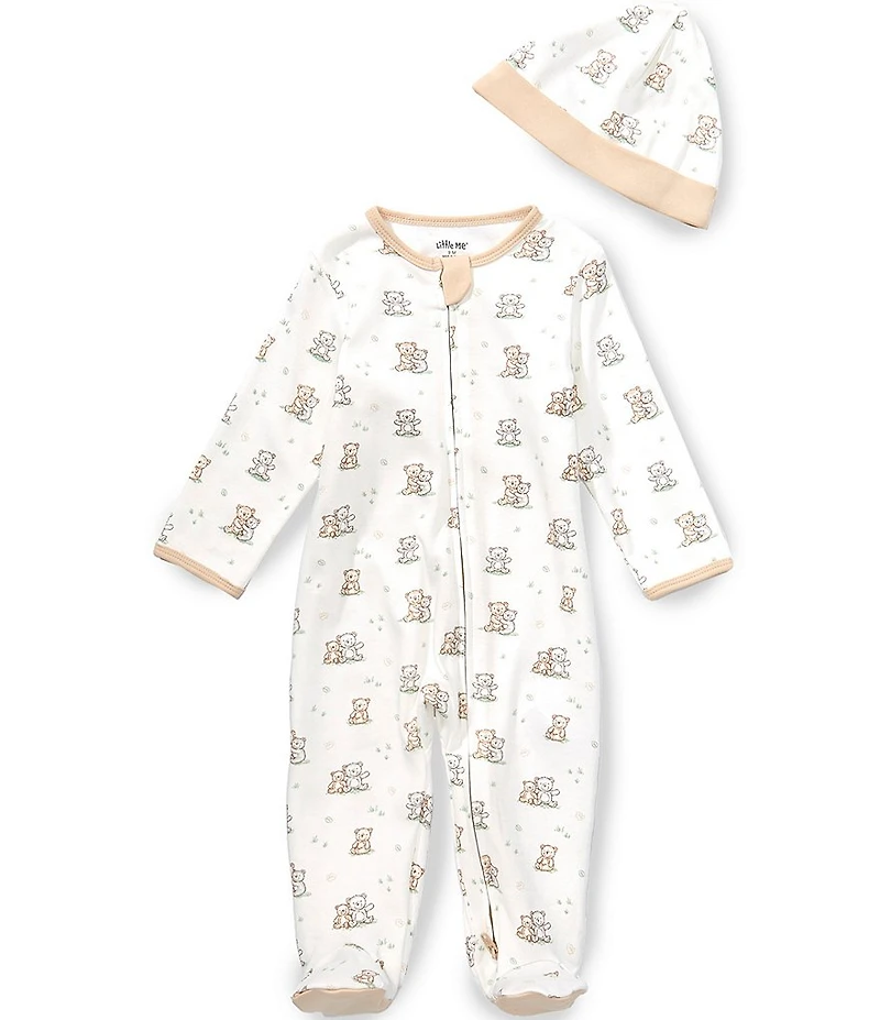 From Little Me, this coverall features: Allover bear print Solid crew neckline Long sleeves Asymmetrical zippered front Footed silhouette Includes matching hat Cotton Machine wash/line dry Imported.