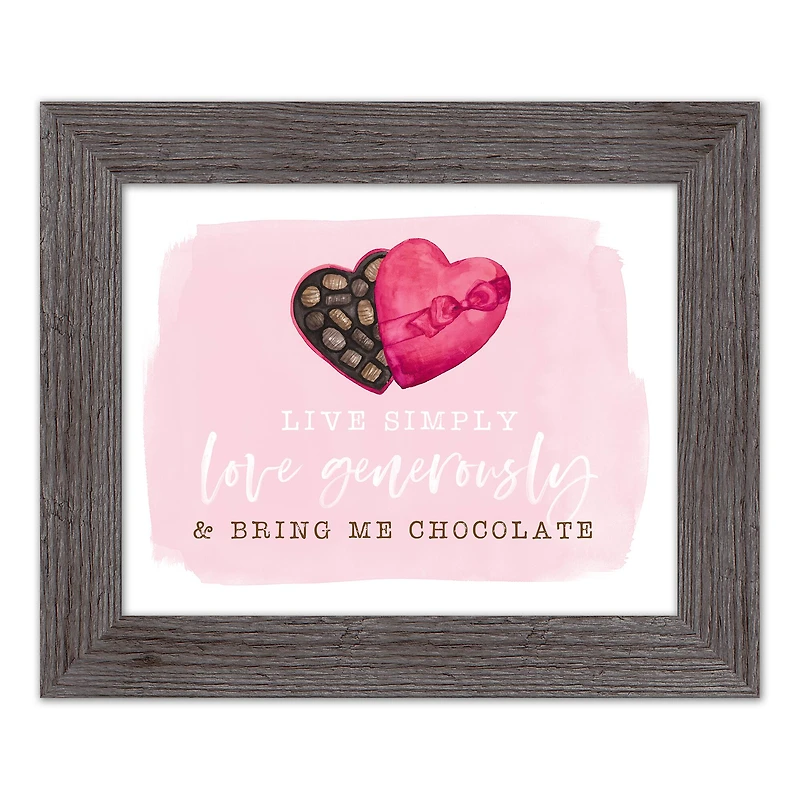 Digitally printed on photo paper with the finishing touch of a frame, this framed print under acrylic adds sophistication to any interior décor.Details:Live Simple, Love Chocolate print11" x 14"Premium, archival quality photo paper and inkAcrylic faceGray frameEasy to use, "no-wire" hanging system included