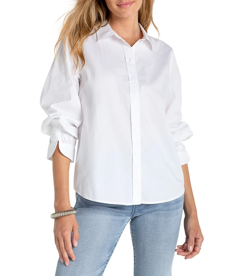 From Liverpool Los Angeles, this shirt features: Woven stretch poplin fabrication Point collar neckline Adjustable long sleeves Back yoke Round hemline Button-front closure Approx. 27" length Cotton/nylon/elastane Machine wash cold/tumble dry low Imported. The Adjustable Sleeve Button-front Woven top is a versatile wardrobe essential that effortlessly combines comfort with classic style. Crafted from stretch poplin, this shirt offers a cozy and breathable feel, making it perfect for year-round wear.