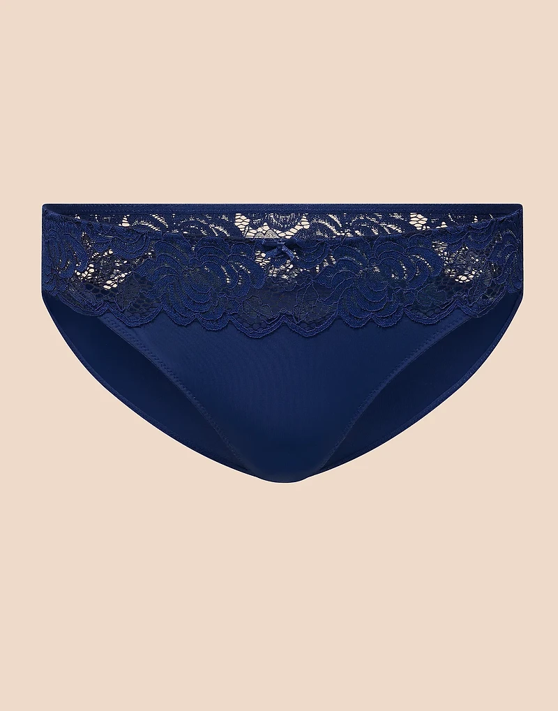 The Livi Cheeky Dark Blue lace cheeky is a romantic essential with irresistible charm. Effortlessly charming, it features a pull-on design, lightweight fabric, Sheer inset, Comfort elastic, and regular rise for all-day comfort and allure. (Available in sizes XS-XL.)