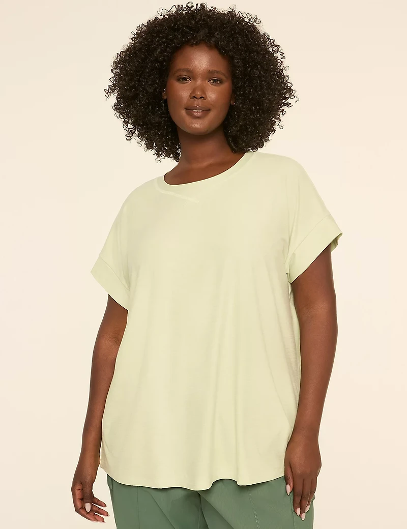 Available in Plus Size A LIVI Soft tee to compliment any bottom. FIT: Classic. Designed for curves and a not-too-tight, not-too-loose, just-right fit. Front Length (On Body): 30" Longer length is perfect for added coverage FABRIC: LIVI Soft. Our (#1 selling!) buttery-soft, light-as-air fabric. Brushed inside & out with 4-way stretch. Machine Wash Cold With Like Colors; Gentle Cycle; Only Non-Chlorine Bleach When Needed; Tumble Dry Low; Cool Iron If Needed 90% Polyester/10% Spandex FEATURES: Crew-neck Short sleeves WHY OUR ACTIVEWEAR IS THE BEST FOR CURVES: Feel-good fabrics, from sweat-wicking to 4-way stretchy, made forcomfort & style. A variety of coverage options to have you covered for every moveyou make. Designed to live in, ultimate life-styling versatility for everywhereyou go. Item Number #414470 Imported Plus Size Top ". Plus Size LIVI Soft Short-Sleeve Recycled T-Shirt, in Pastel Green, 10/12, Women's, Lane Bryant