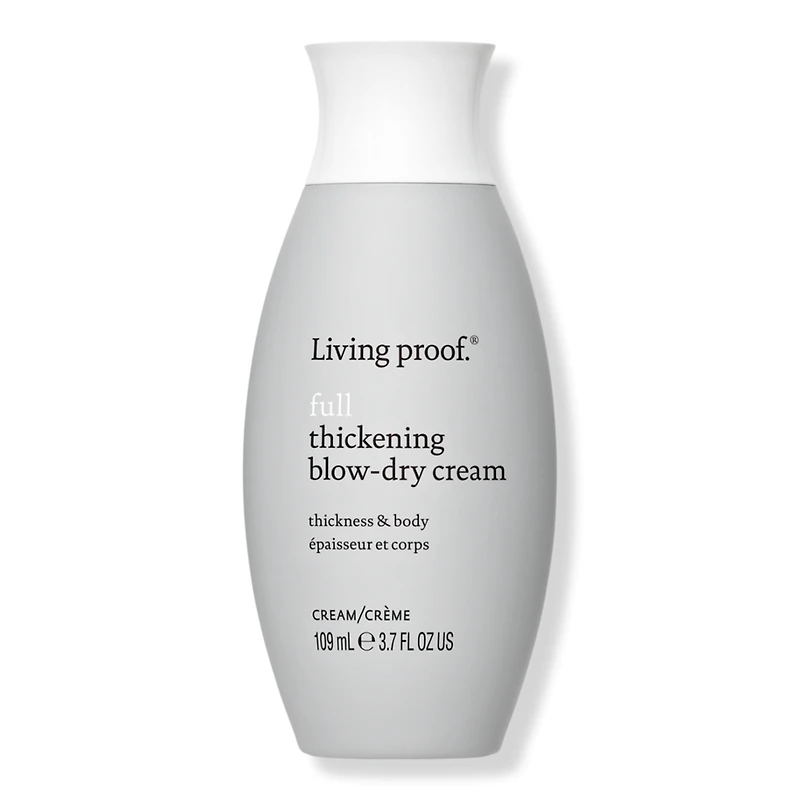 FULL THICKENING BLOW DRY CREAM 3.7OZ. Benefits: Delivers 30% thicker-looking hair*. Creates fuller-looking, denser-feeling hair with style longevity that lasts all day. Smooths hair and adds shine. Provides lightweight conditioning. Leaves hair more manageable and with more movement. Heat protection up to 450F/232C. *Versus untreated. Key Ingredients: Time-Released Styling Technology: Proprietary, time-released technology formulated with Living Proof's patented Thickening Molecule and water-soluble resins to create long-lasting body, fullness, and hold - without the stickiness.. Thickening Molecule: Patented Lp. technology that deposits microscopic thickening dots between individual strands so hair looks, feels, and moves like its fuller.. Amaranth peptides: Plumps individual hair fibers for bouncy, fuller-looking hair.. Hydrolyzed corn starch: Provides light oil absorption to aid in style longevity.. Optimized resin blend: Adds lasting hold that enhances body.. Mushroom extract blend: Provides heat protection to prevent thermal damage.. Formulated Without: Silicones. Sulfates (SLS + SLES). Parabens. Phthalates. Formaldehyde.