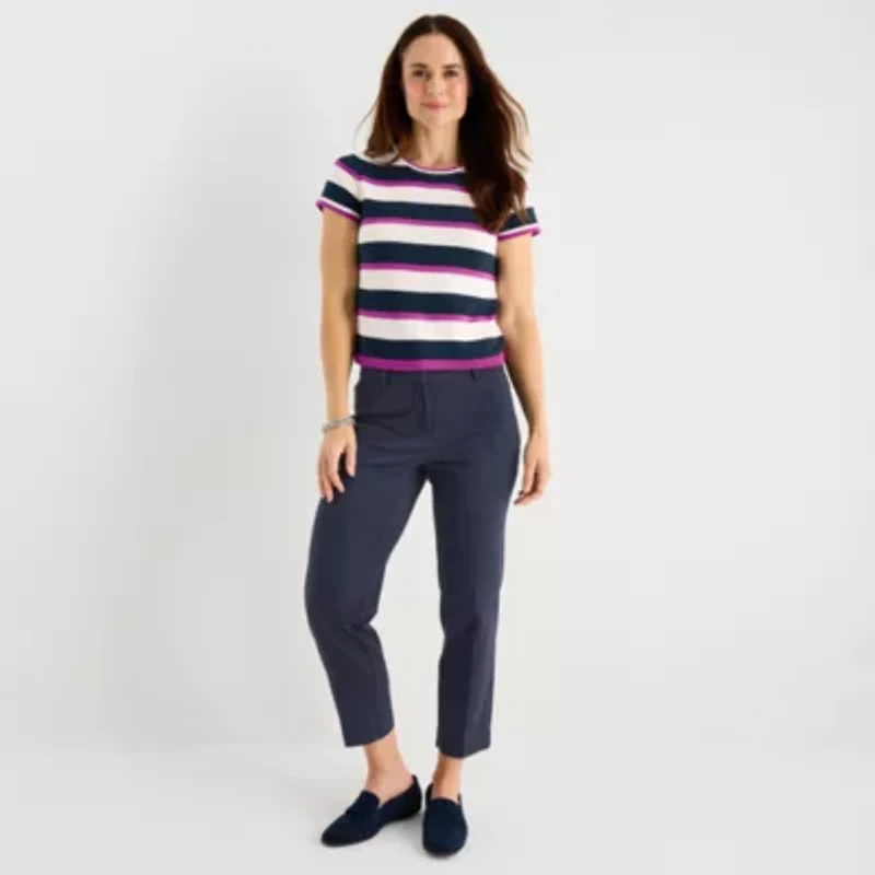 Liz Claiborne Petite Womens Crew Neck Short Sleeve Striped Pullover Sweater