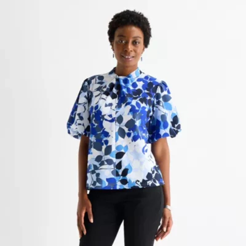 The Liz Claiborne women’s blouse offers a sophisticated and airy feel with its delicate texture. This top showcases a mock neckline paired with short sleeves, perfect to be worn with high-waisted trousers or a sleek midi skirt.