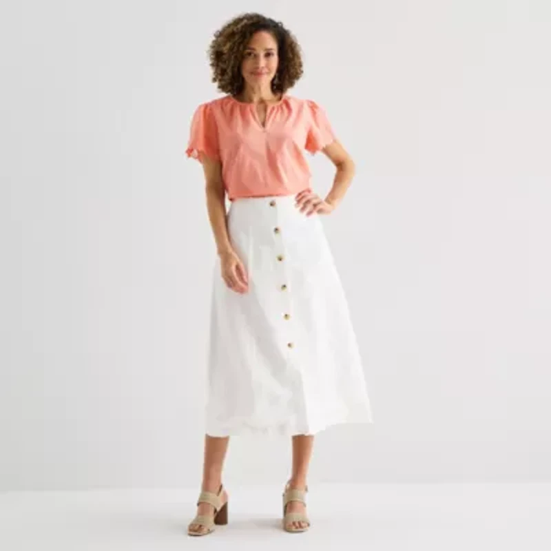 Essential for warm-weather style, this women's A-line midi skirt by Liz Claiborne is made from a lightweight linen-blend with front button closures. Try yours with a t-shirt or blouse tucked into its smooth waist.