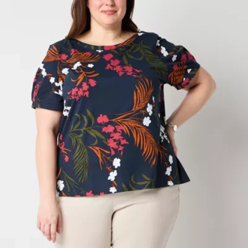 Crafted from soft floral-print cotton with a flattering boat neck, this Liz Claiborne women's plus short-sleeve blouse is the kind of piece you'll want to wear again and again. It's cut for a regular-fit with an easy pullover design. Pair it with jeans or wide-leg trousers.