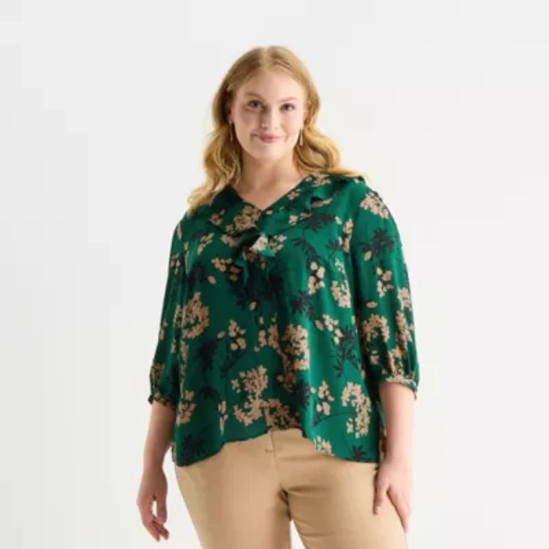 Liz Claiborne Womens Plus V Neck 3/4 Sleeve Blouse