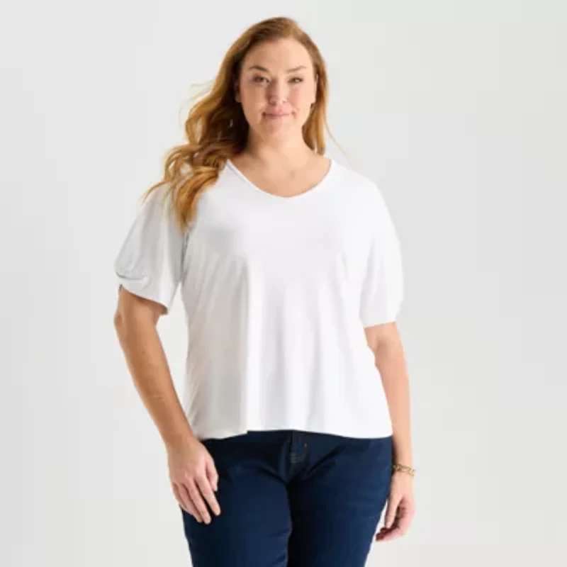 This Liz Claiborne women's plus blouse is a chic, comfy piece for everyday styling. Made from soft stretch-ponte, it has a v-neck and short ruched sleeves. Wear it with jeans or pants.