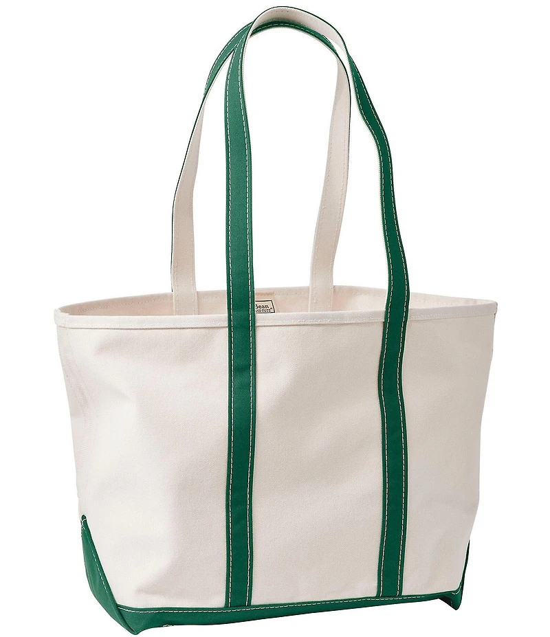 From L.L. Bean, the Open-Top Long Handle Boat and Tote Bag features: There's only one Boat and Tote ours. From the heavyweight canvas to the reinforced handles to the double-stitched seams, nothing compares to our Boat and Tote. Still crafted in Maine, one tote at a time. Introduced as Bean's Ice Carrier way back in 1944, the Boat and Tote was billed as a bag made of builders' canvas for hauling ice from car to ice chest. Today you can spot our iconic tote doing heavy lifting everywhere - from the grocery store to the beach, to the library and commuter train. Tested to hold up to 500 pounds, it'll carry more than you can carry. We promise. Spot clean Heavy-duty approx. 24 oz. cotton canvas Double-layer base. Handles tested to hold up to 500 pounds Reinforced flat canvas bottom Overlapped seams are double-stitched with nylon so they won't rot or break Natural color, with contrast-tone handles Medium approx: Capacity approx. 1,008 cu. in., 17 L Dimensions approx.: 12" H x 13" W x 6" D Handles approx. 14" Large approx: Capacity approx.: 2,124 cu. in., 35 L Dimensions approx. 15" H x 17" W x 7" D Handles approx. 14" Made in the USA.