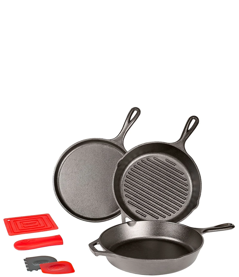 From Lodge, this cast iron set features: Get everything you need to sizzle, all in one set! This set features a skillet, grill pan, and griddle, so you can make all of your favorites. Cast iron provides great heat retention, incredible durability, and a naturally seasoned cooking surface that’s ready to go, straight from the foundry. Plus, you’ll get a handle holder, pot holder, and two pan scrapers—each specially designed for cast iron cooking and cleanup.  Cast Iron Seasoned with 100% natural vegetable oil Great for indoor or outdoor cooking Cast to last for generations Compatible with any stovetop (including induction), oven, grill, or campfire Nontoxic cookware made without PFAS Silicone pot holder: Non-slip silicone prevents accidents Protects hands from heat up to 250F Hot handle holder: Designed to help you get a secure grip on hot cast iron—up to 500. Dishwasher safe No direct flame; not intended for use in oven Not intended for use during cooking, grilling, or baking Pan scrapers: Made of rigid, easy to clean polycarbonate Assorted angles get into all nooks and crannies Set Includes: Approx. 10.25" Seasoned Cast Iron Skillet Approx. 10.25" Seasoned Cast Iron Grill Pan Approx. 10.5" Seasoned Cast Iron Griddle Approx. 6" Red Silicone Pot Holder Red Silicone Hot Handle Holder Set of 2 Pan Scrapers Made in USA Product Disclosure