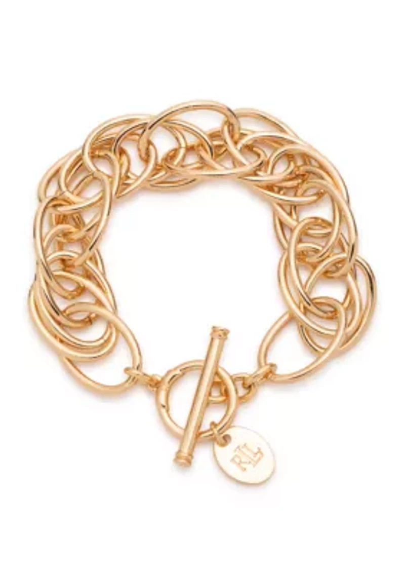 Designed with polished logo links, this sleek bracelet delivers a modern, elevated look with a flexible fit for effortless comfort. The refined silhouette makes it perfect for everyday wear while adding a recognizable, luxe finish to any outfit—whether worn alone or layered with your favorite pieces. Toggle closure Polished finish Imported Product Specifications 8" L Material & Care Gold-tone metal Clean with a soft cloth