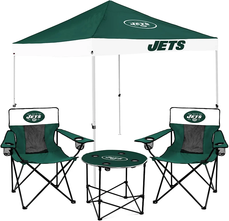Get ready for game day with the Logo New York Jets Tailgate Bundle. This bundle includes 2 chairs, 1 table and 1 canopy constructed with steel and polyester to withstand wear and tear, while the team decorations let everyone know you're rooting for the Jets.