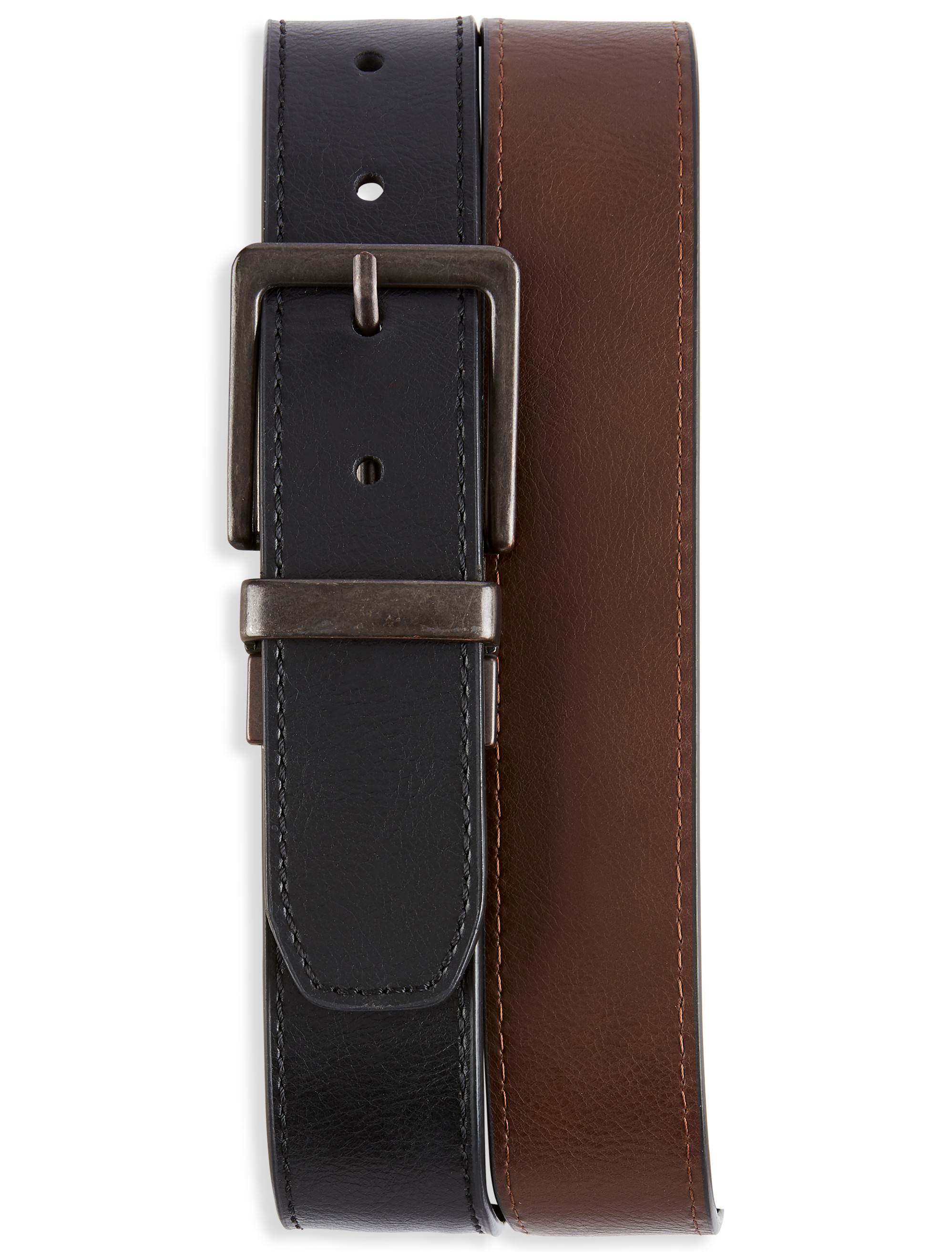 A heavy-duty buckle adds a rugged edge to this stitched belt, designed reversible for versatility. It's the perfect way to upgrade your casual style.