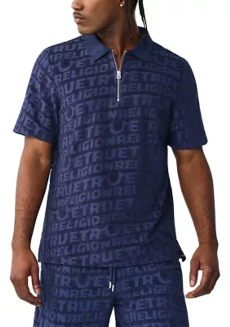 This True Religion Terry Logo Zip Polo is built for subtle boldness. Made from breathable terry cloth, this polo features a half-zip collar for a sharp look and an all-over tonal logo that stands out. Spread collar Short sleeves Colorblock pattern Imported Material & Care Cotton, polyester Machine washable