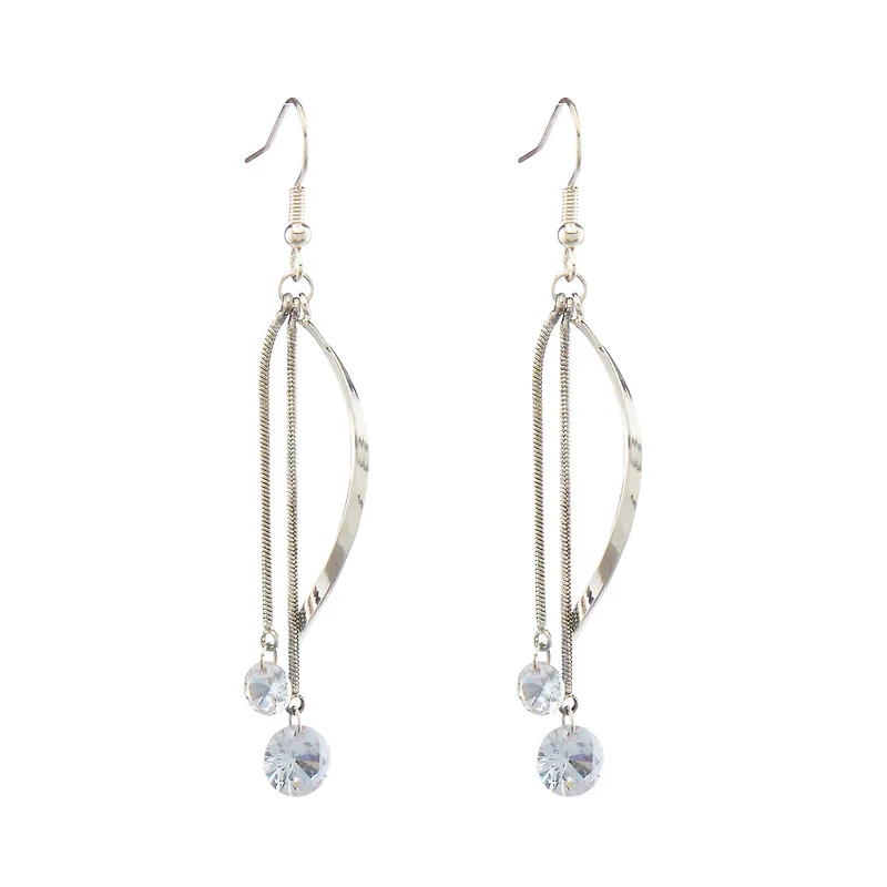 Each earring showcases a sleek, twisted metal hoop with a shimmering finish, reflecting light beautifully with every turn of your head. Dangling gracefully from the hoop, a delicate chain adds a touch of dynamic movement, leading to a sparkling crystal accent that captures and refracts light for an eye-catching sparkle.