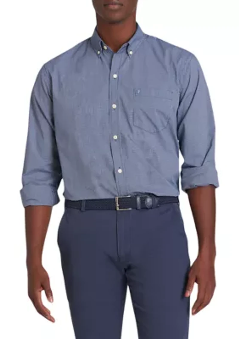 A small blue check print gives a put-together look to this crisp button-down shirt from IZOD. Button closure Button-down collar Long sleeves Imported Material & Care Cotton, polyester Machine washable