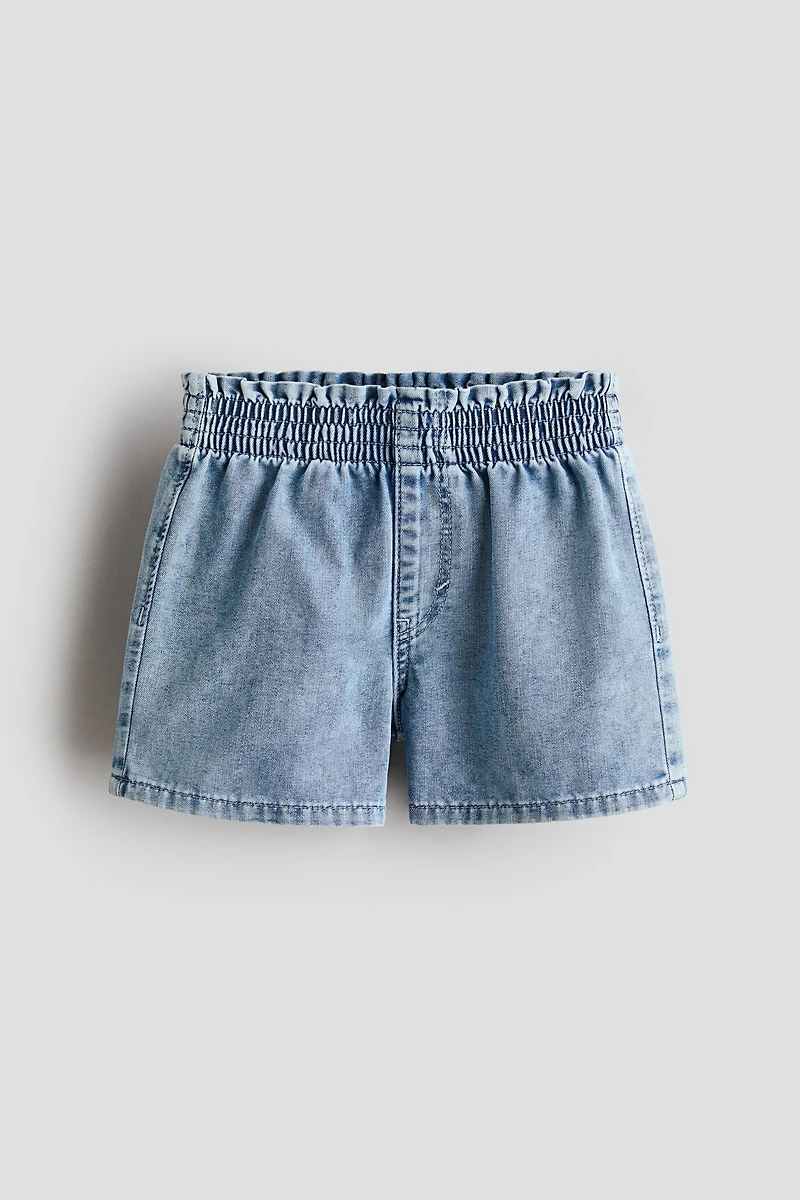 Loose-fit, easy pull-on shorts in lightweight, washed denim. Smocked, elasticized waistband with mock fly.
