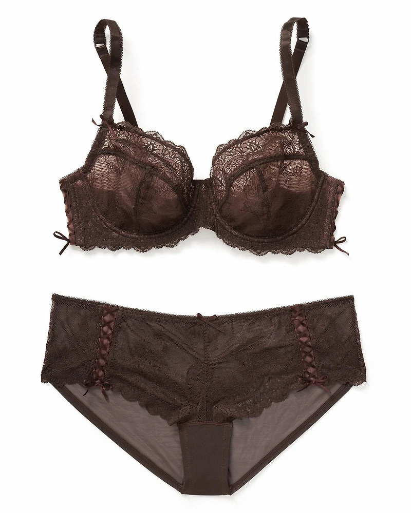 The Loretta unlined demi bra in coffee bean is a beautiful and sexy style with three-piece all-lace cups, a lace-up side detail, and fully adjustable straps. The matching hipster panty in coffee bean completes the look. (Available in plus-sizes 38DD-46DDD.)
