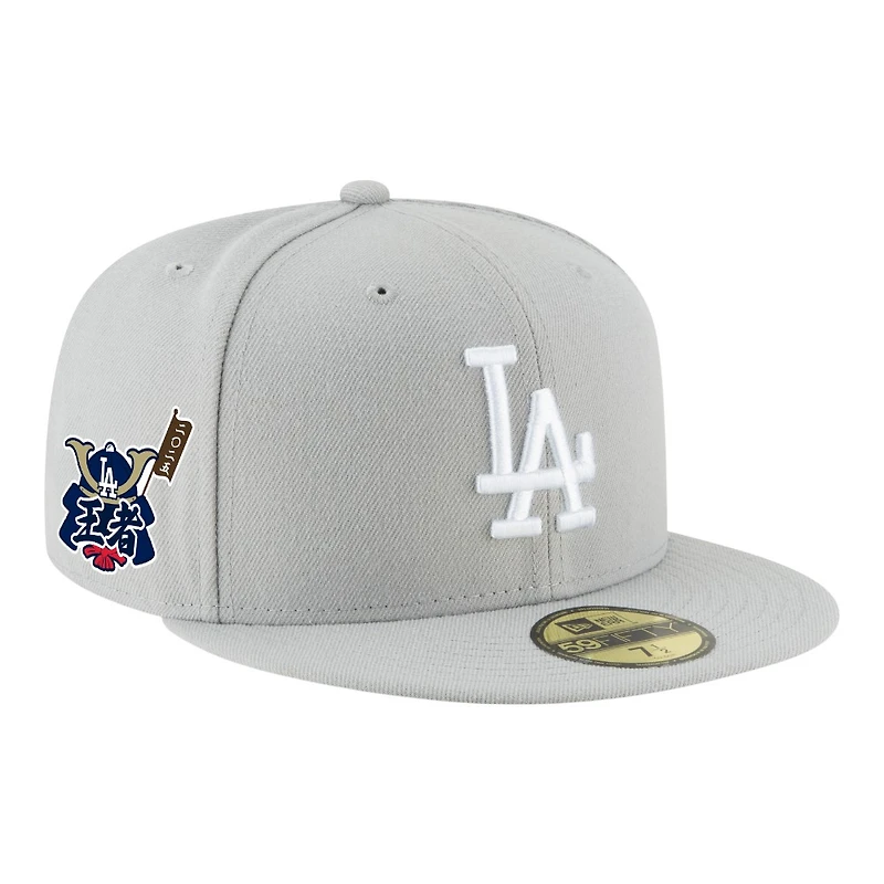 The Los Angeles Dodgers Gray World Series Champs Samurai Patch Grey UV New Era 59FIFTY Fitted Hat is a great fashion headwear piece with a grey undervisor and a Samurai Side Patch. It is made by New Era.