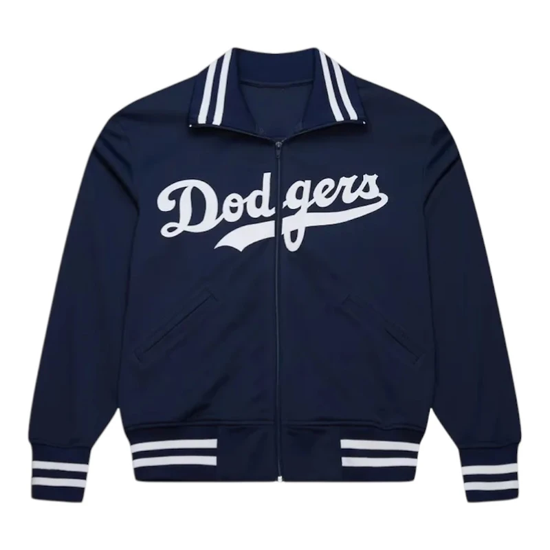 This Los Angeles Dodgers Navy Batting Practice Full-Zip Mitchell & Ness Jacket is a Mitchell & Ness jacket. It has a full zip front with the Dodgers script logo across the chest.