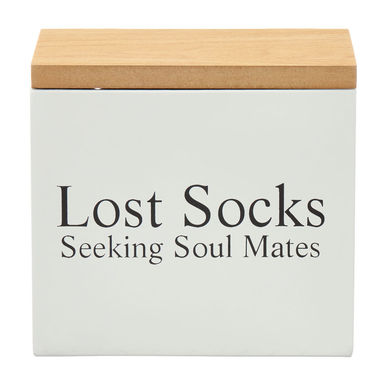 Crafted with a sleek, contemporary design, this laundry bin features a sturdy white frame and a natural wood lid that adds a touch of rustic elegance to your space. The front of the bin is playfully inscribed with the phrase "Lost Socks - Seeking Soul Mates," bringing a bit of humor and personality to your laundry routine.