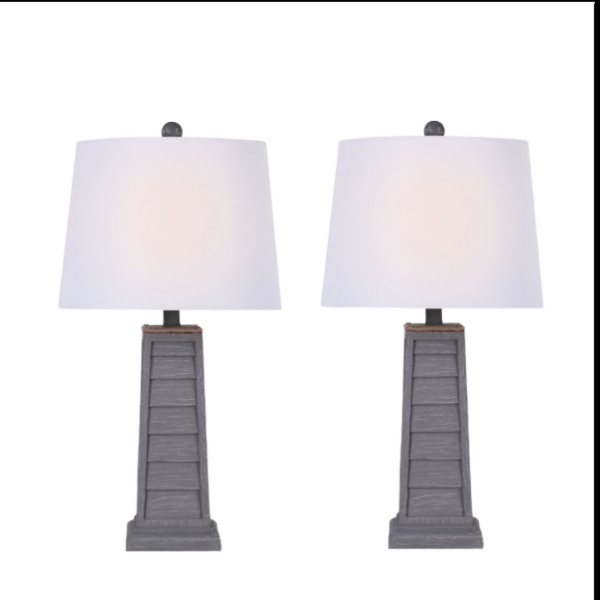 Light up your traditional farmhouse space with the set of Gray Louvered Shutter Table Lamps! The white linen shades, shutter bases, and distressed finish create a striking design. Set includes two (2) lamps Overall lamps measure 25H in. each Crafted of resin Antique gray finish Louvered shutter base Hardback tapered shade in white linen fabric Shade measures 11L x 13W x 9.5H in. Socket accommodates a 100-watt, A19 bulb Features a brown, plug-in cord On/off single switch type Care: Dust with a soft, dry cloth. Do not exceed specified wattage. This item is available at Kirklands.com only, not available in stores. Please note: this item cannot be shipped to APO/FPO addresses.