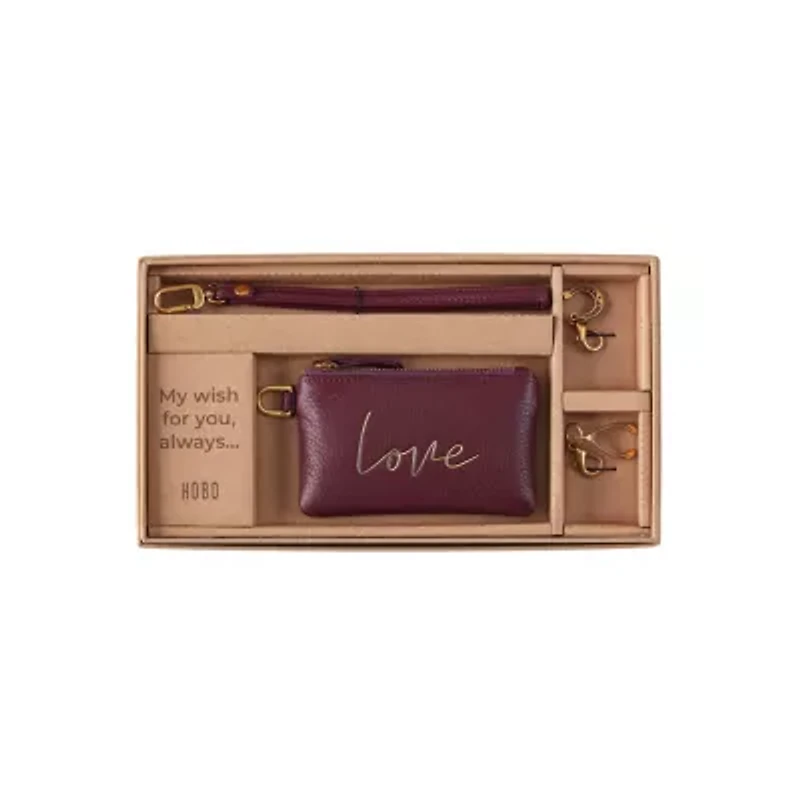 HOBO LOVE GIFT BOX 11 6.5" Wristlet Strap Drop This gift set includes a small zip pouch with removable wristlet and charms, in a custom box display. Imported Product Specifications Box Dimensions: 10.5 W x 5.5 H Material Leather trim Leather